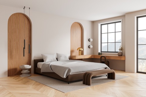 寝室など落ち着きのある雰囲気にしたい場所には、グレーや木目調などのクロスを用いると、心地良い囲まれ感でリラックス空間を演出できます。