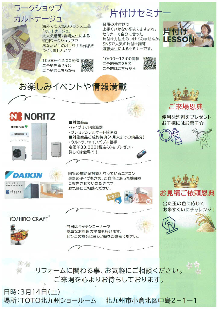 「お客様来てくだ祭」を3.14(土)にTOTO北九州ショールームで開催いたします!