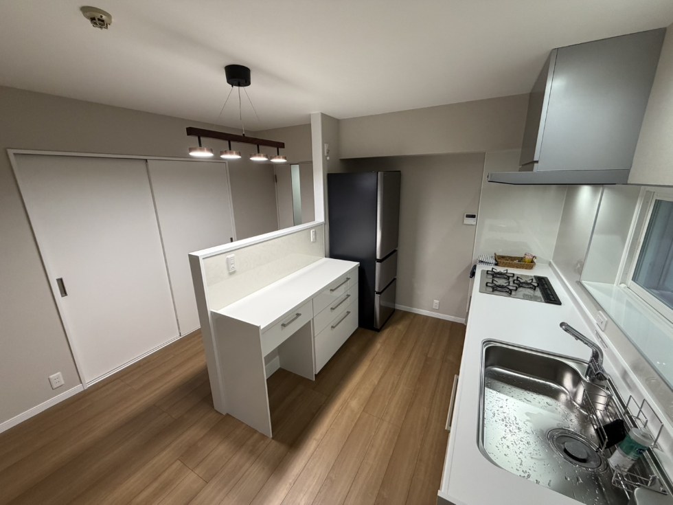 反対側に間仕切り壁を設置し、同色のカウンターを取付け、作業・収納スペースを増やしました。