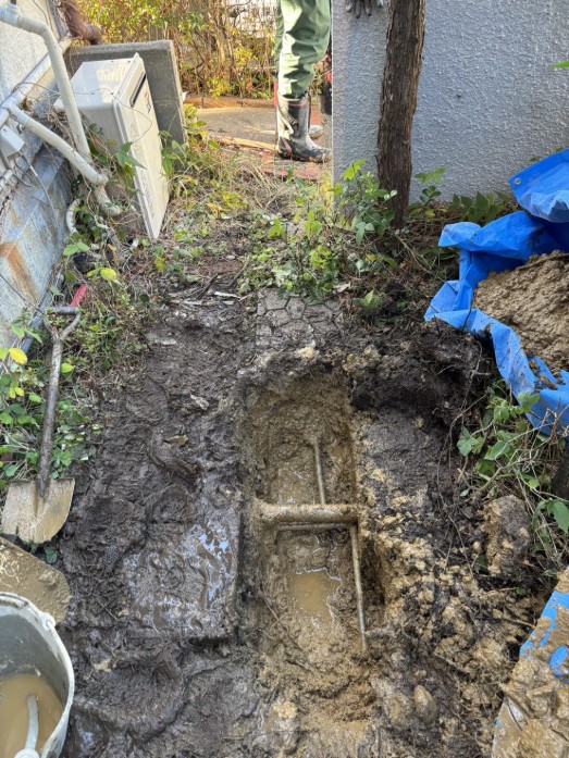 掘削して調べたところ、老朽化による水道管の漏れだったので、一部補修させていただきました。