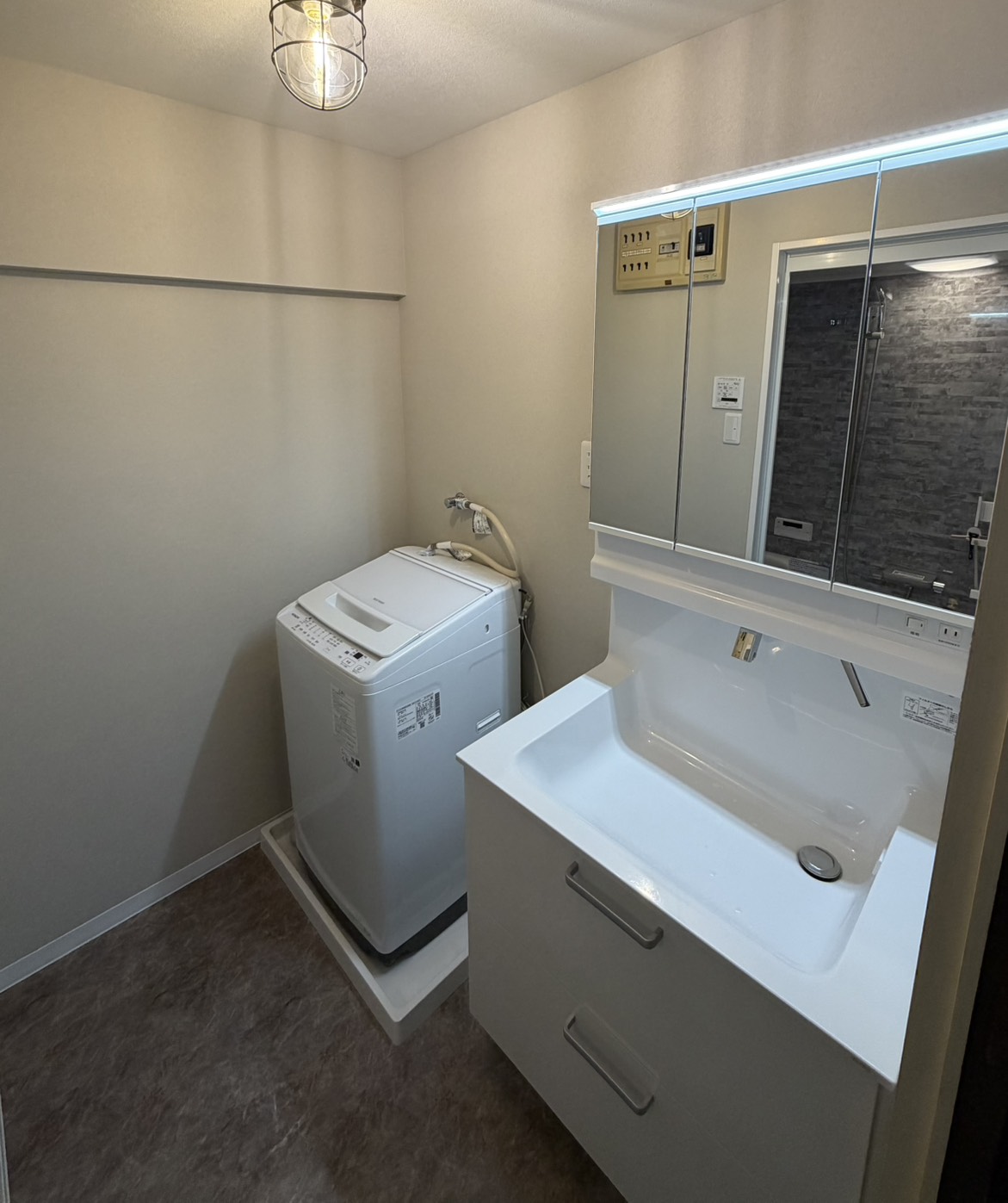 木目調の洗面所から白が映えるモダンなユニットバス・洗面所に仕上がりました。