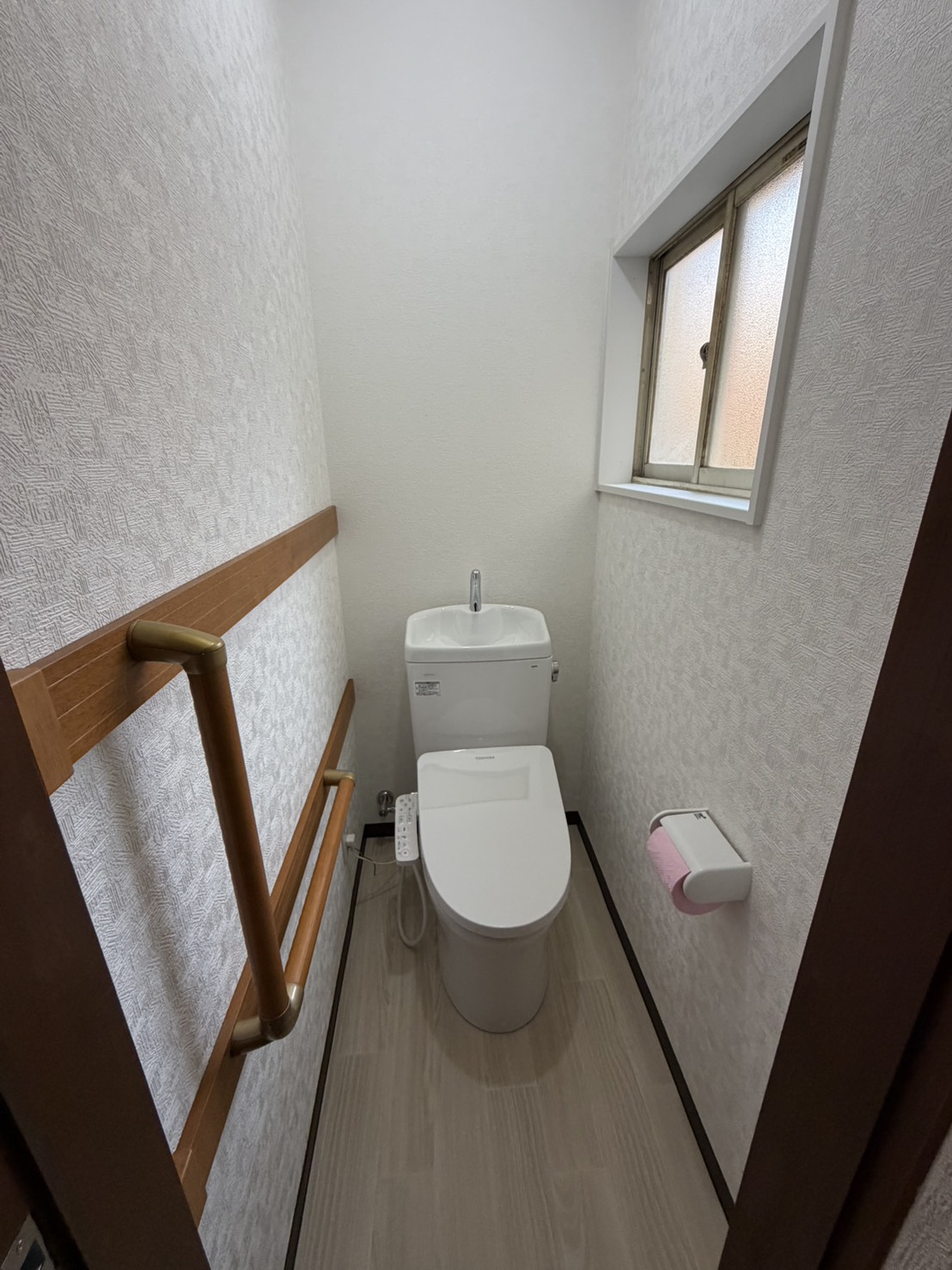 壁クロス・床クッションフロアーを張替え、白基調の清潔感のあるトイレ・洗面化粧台になりました。